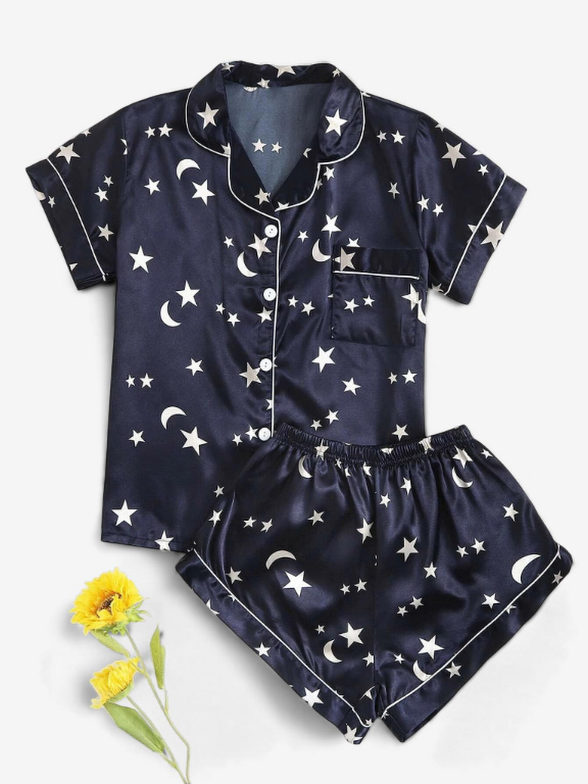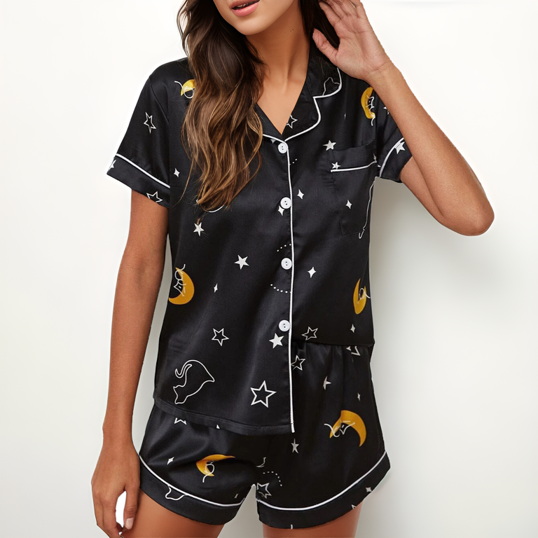 Picture yourself stepping out onto the balcony with morning light reflecting off the smooth satin of these playful pajamas.