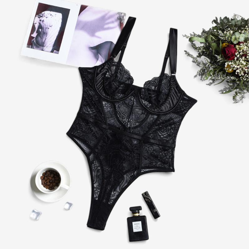 An intricate lace bodysuit with strategic cutouts, underwire cups, and a sculpting high-leg silhouette.