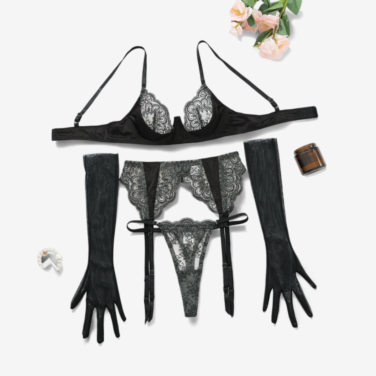 An elegant lace lingerie set with scalloped detailing, underwired support, and a high-waist garter belt for a timelessly flattering fit.