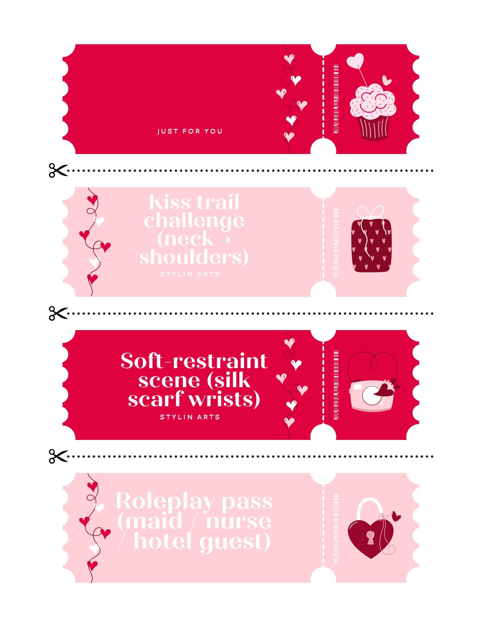 Instant digital download. Nothing ships. A clean, minimal set of red/pink ticket-style love coupons — 32 pre-filled coupons. Not editable. Download the ZIP, print, cut, and play.