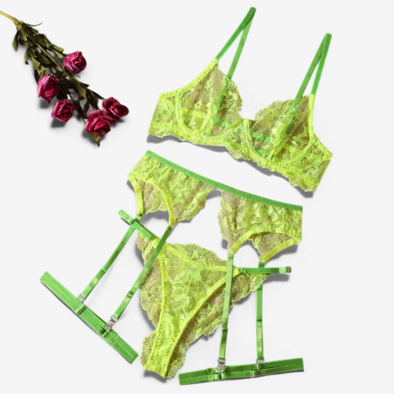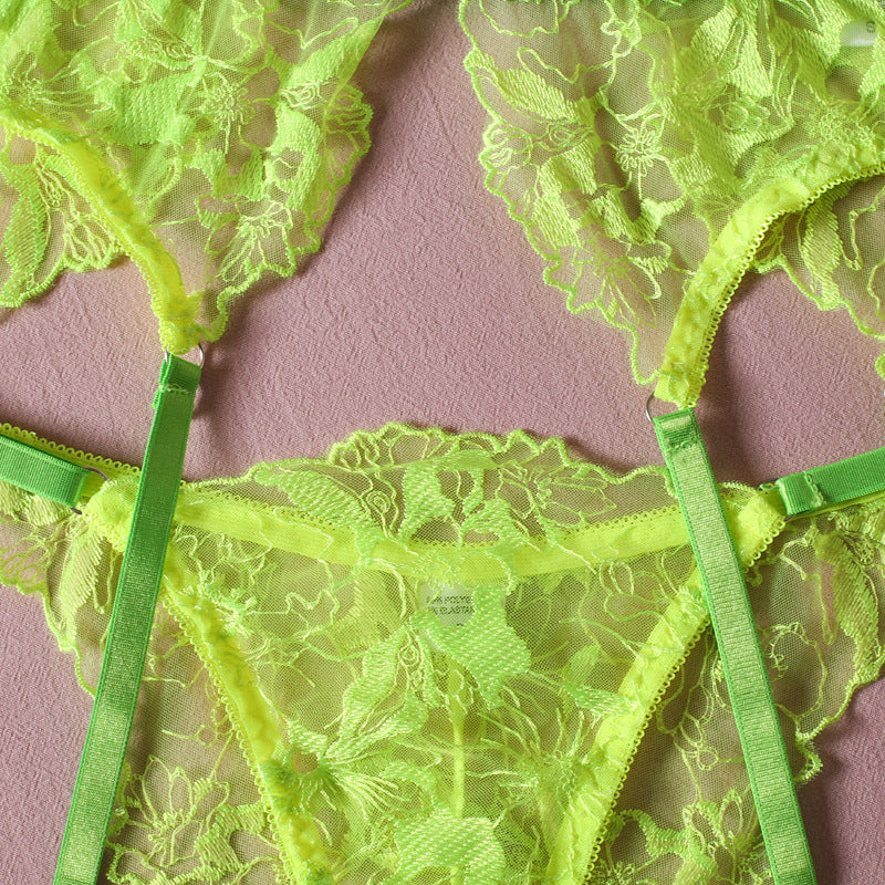 Material & Feel: Soft floral lace in a bold neon green hue with sheer mesh accents. Breathable, slightly stretchy, and smooth against the skin. Perfect for humid climates or sultry settings.