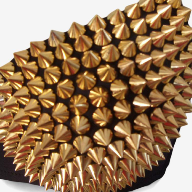 Both versions feature densely packed cone spikes—gold or silver—angled in rows that radiate outward. No lace or fabric overlay, just bold, unapologetic embellishment.
