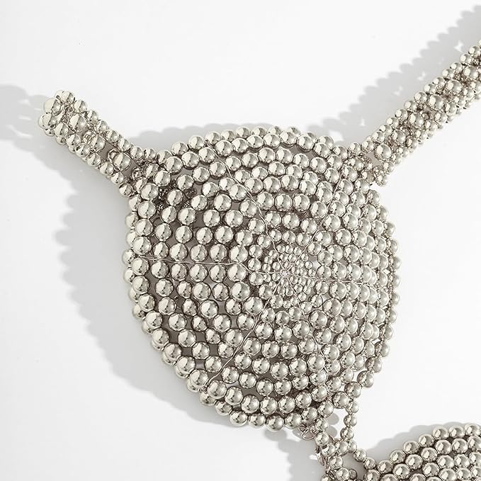 A couture bra crafted entirely from metallic beads, featuring circular beaded cups and beaded straps for a radiant statement piece.