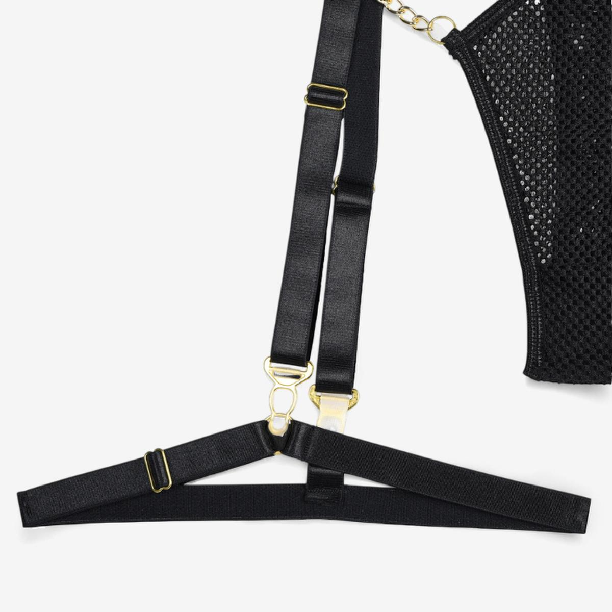 Mesh underwire bra, high-cut thong, and coordinating harness belt with adjustable garter straps. Features open neckline strap detailing, waist-hugging elastic bands, and gold-tone chain accents at the bust and hips.