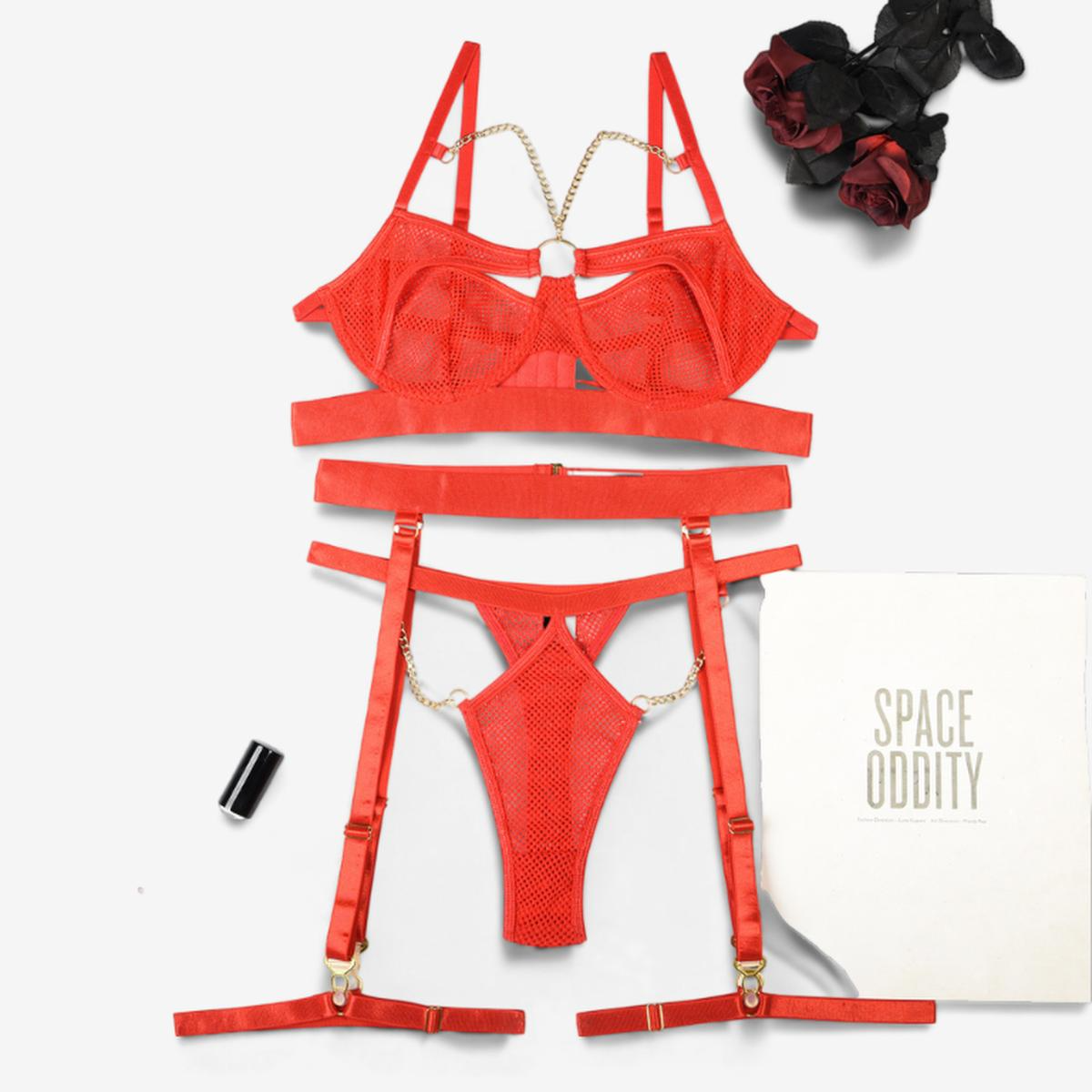 A bold three-piece lingerie set in mesh and gold-tone chain accents, designed with precision strapwork to frame and elongate the silhouette.