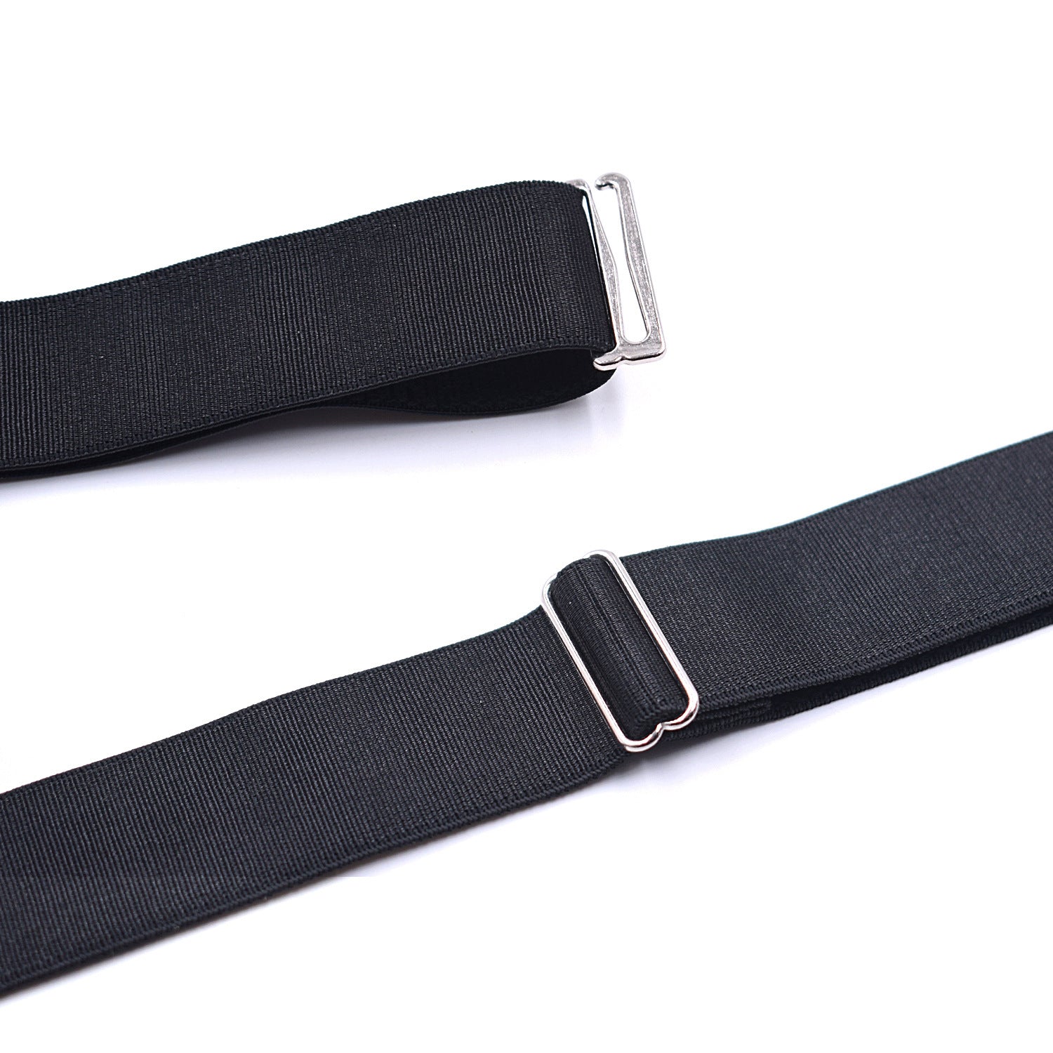 Cross-strap elastic garters with 2.5 cm bands, four metal stocking clips, and length adjusters for a clean, supportive fit.