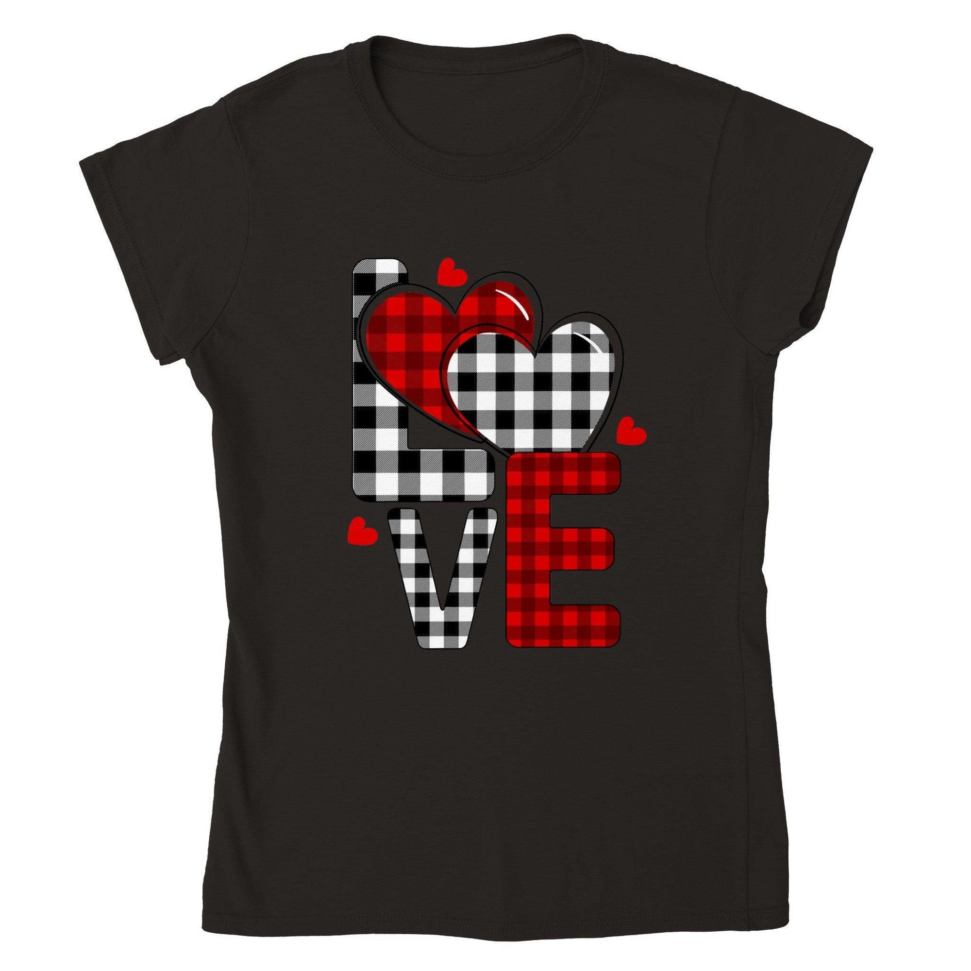 Made with buttery-soft preshrunk jersey knit, this fitted tee is breathable, flattering, and made to move with you. The crisp print detail keeps the bold plaid graphics sharp, and the smooth surface gives your love-day look standout quality. Style with distressed denim and boots, or go full cozy with leggings and a cardigan.