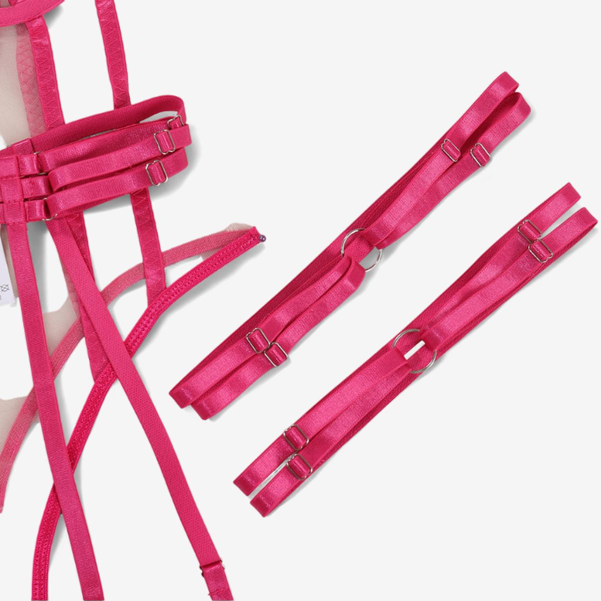 High-shine pink satin straps, O-ring hardware, and precision-cut mesh create a strong visual impact. The triple waistband belt cinches the waist and visually separates the bust from the hips, creating an hourglass illusion.