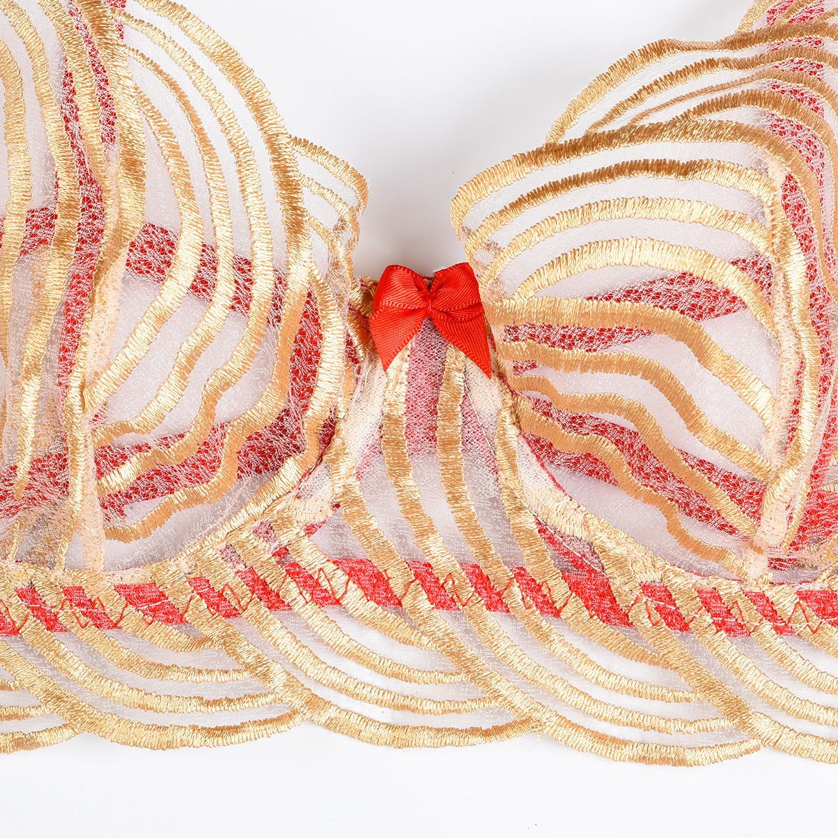 Design Details: The golden scalloped embroidery adds elegance, while the red satin trims provide striking contrast and edge. Small red bows at strategic points (center bust, garter) add a playful, feminine touch.