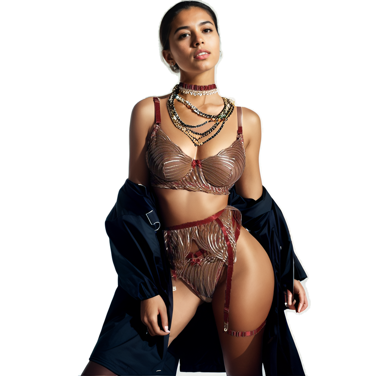 When I look at this luxurious golden and crimson set, I immediately envision it paired with a sheer, floor-length robe in deep burgundy or champagne gold to elevate the sensuality while adding a layer of mystery.