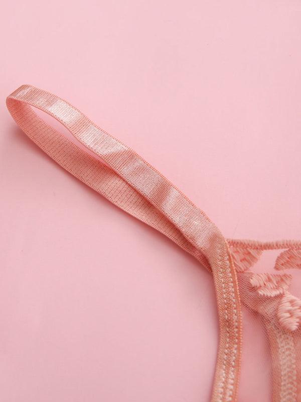 Precision floral embroidery on sheer mesh, satin elastic trims, adjustable garter and shoulder straps, and a keyhole cut-out detail at the bra center gore.