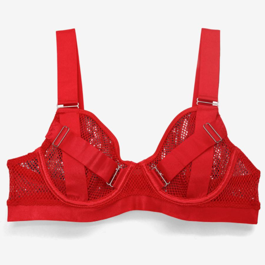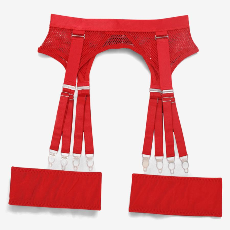 Fine stretch mesh with bold harness straps, structured underwire, adjustable metal hardware, and seamless garter connectors for sleek functionality.