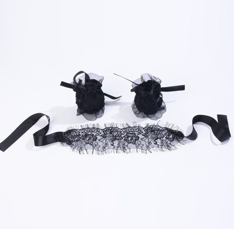 Unleash your sensual mystique with the Enchanting Lace Flirtation Set, an exquisite three-piece ensemble designed to elevate your most memorable moments. Crafted from delicate lace and high-quality polyester, this set features a trio of thoughtfully coordinated accessories—lace goggles, a handkerchief, and a bracelet—all created to add an air of captivating elegance and refined allure.