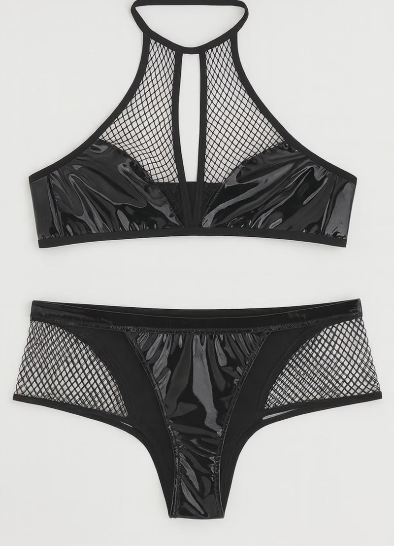 A sleek mesh high-neck bralette with structured cup support, paired with a coordinating brief featuring breathable mesh panels for a refined, modern finish.