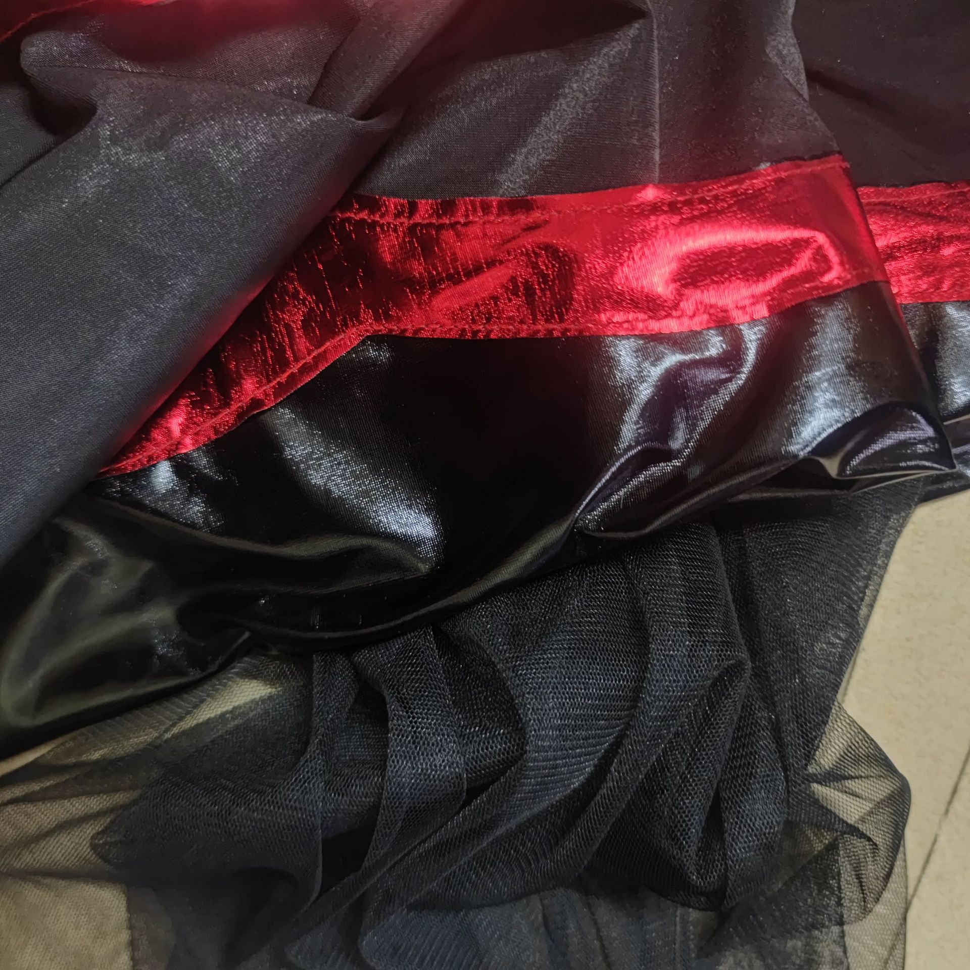 A devil-themed role-play gown in wet-look fabric with red velvet panels, crisscross neckline, dramatic front slit, pointed collar accents, and mesh cape sleeves with long gloves.