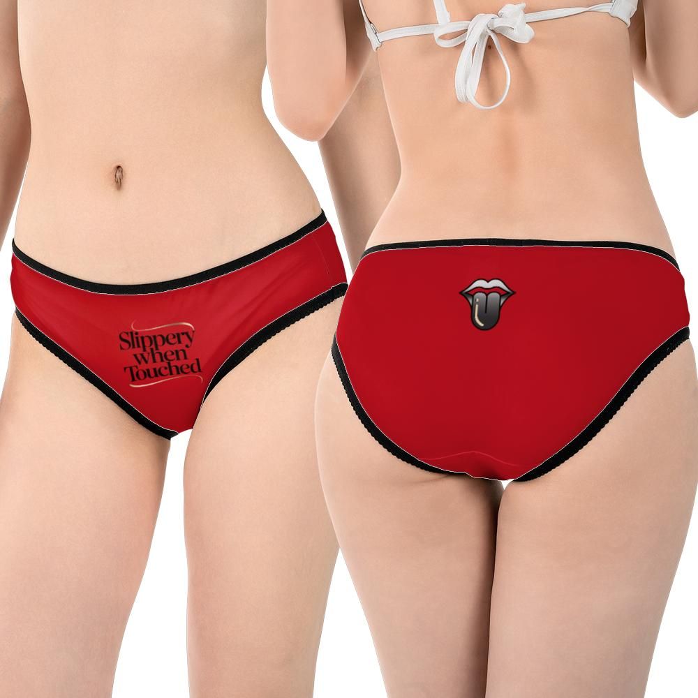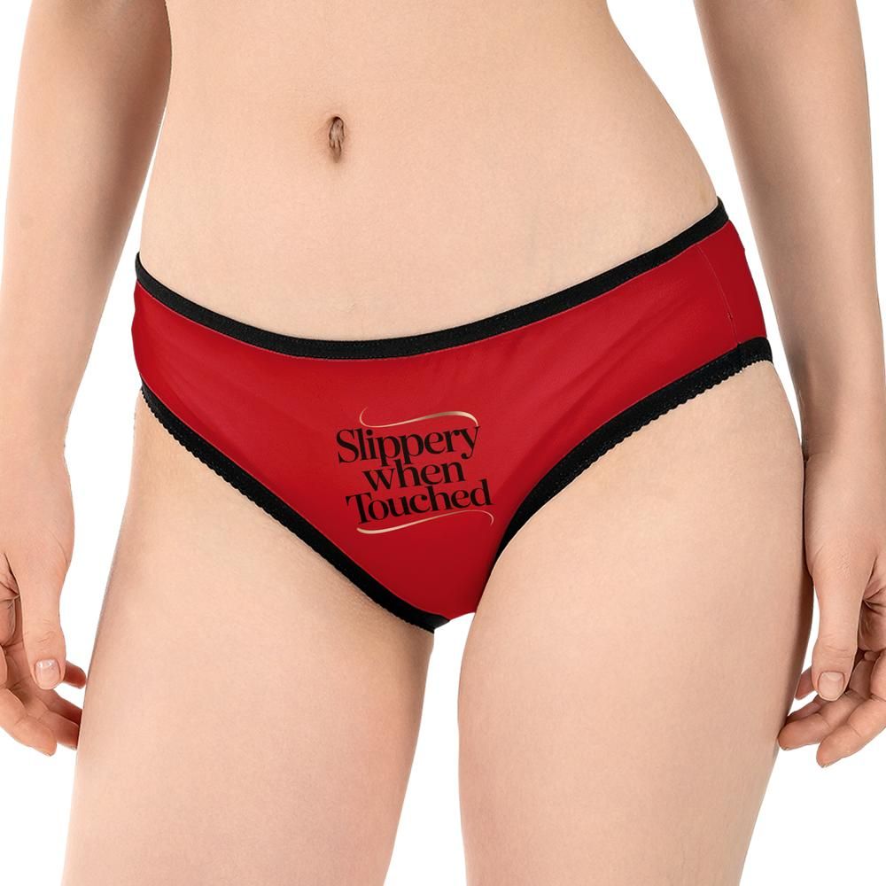 A sleek mid-rise brief with italic sans lettering reading “Slippery When Touched” and a polished chrome accent at the back.
