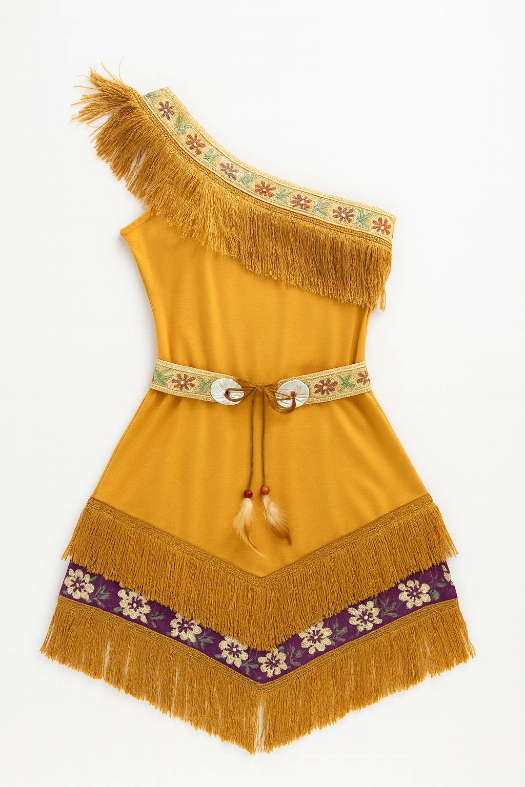 The costume features a one-shoulder fringe dress with intricate patterns and a matching belt, designed to enhance your figure while providing a comfortable fit. The rich, earthy tones and detailed embellishments make this outfit a standout choice for any occasion. Whether you're performing on stage or attending a themed party, this Native American inspired costume is sure to make a lasting impression.