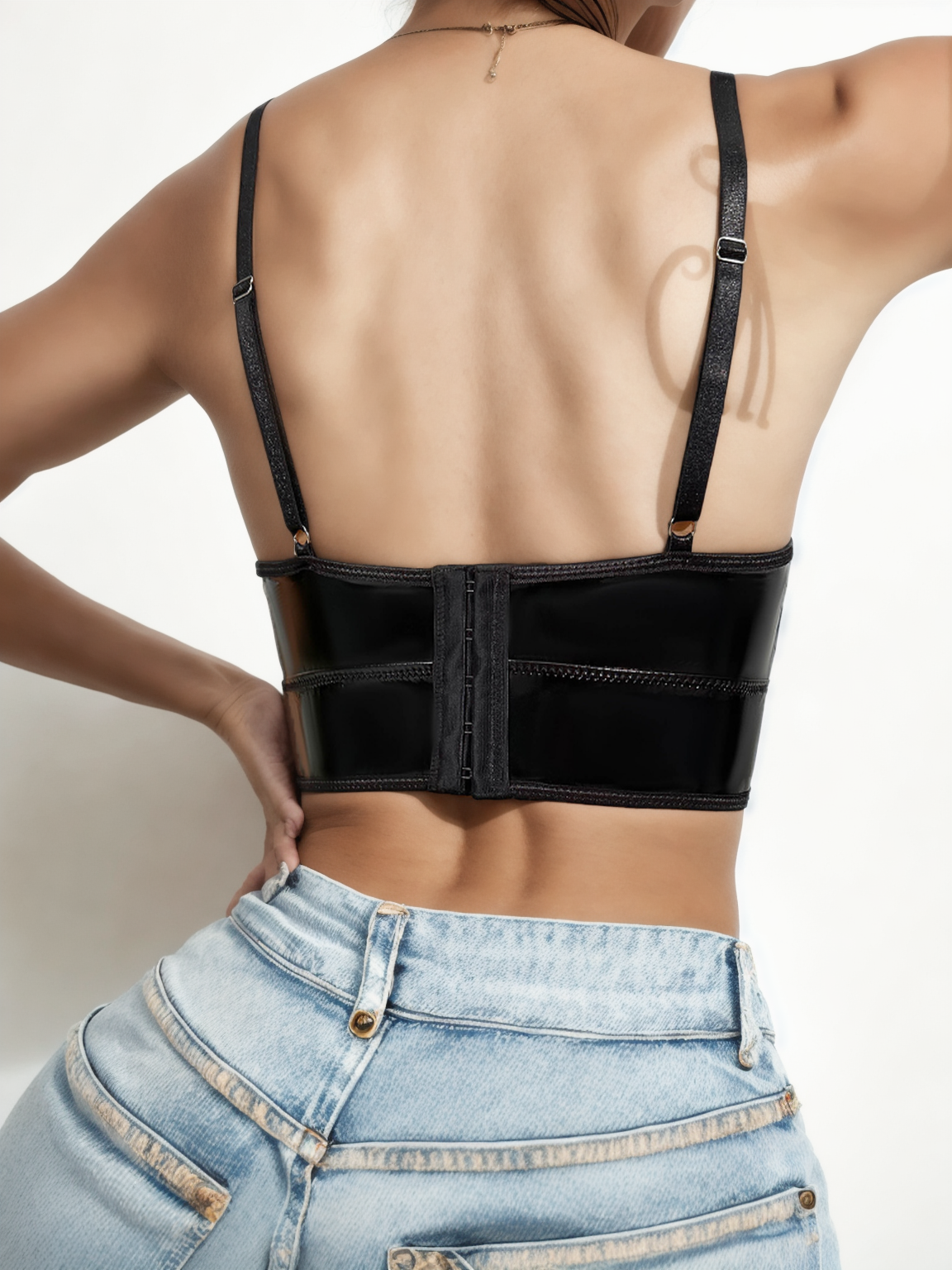 Glossy vinyl fabric with reinforced stitching, metallic ring accent at front, stretch underbust band, and narrow elastic strap adjusters for fit control.