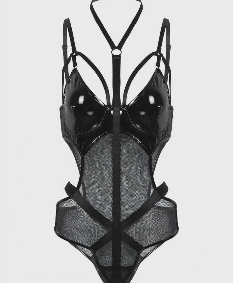 A modern bodysuit that blends sleek patent panels with sheer mesh and harness-inspired strapping. Designed with a contoured silhouette, structured cups, and high-cut legs, it delivers a bold, architectural look with a flattering fit.