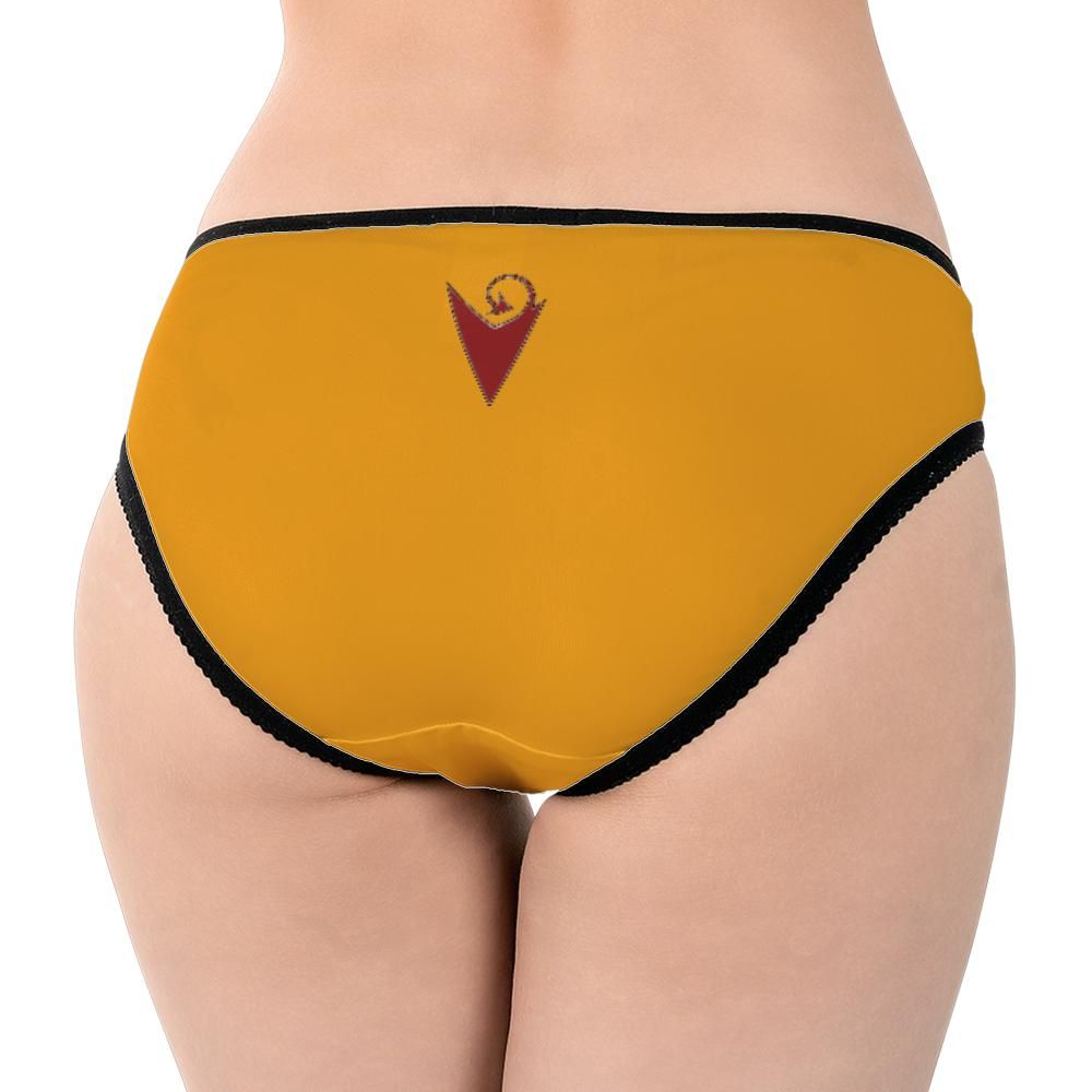 Mid-rise bikini silhouette with clean leg lines and moderate coverage. The front is defined by dramatic arched serif lettering, while the back carries a compact blade-inspired icon. Strong contrast between black base and metallic lettering elevates the visual impact.