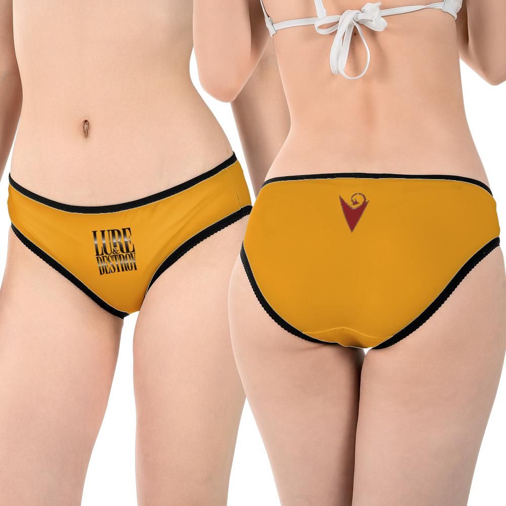 A sharp mid-rise brief in black featuring arched serif text “Lure & Destroy” on the front and a minimalist blade accent at the back.