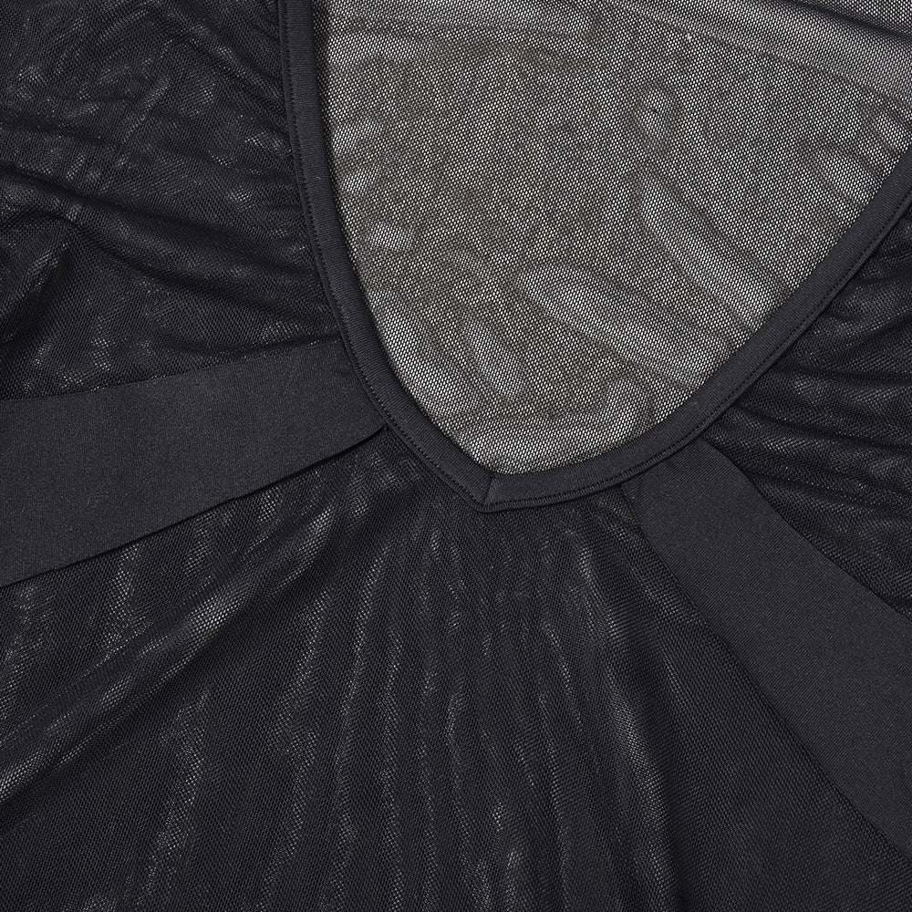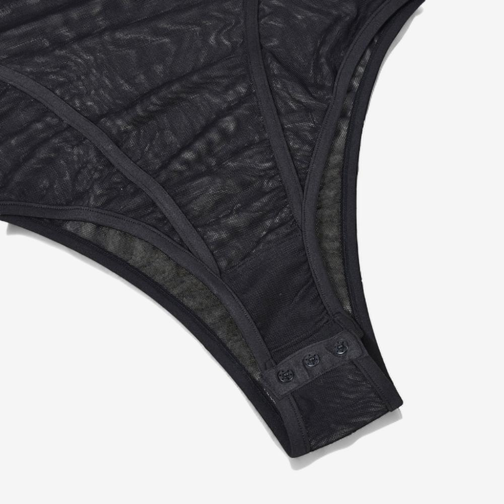 Sheerness & Coverage: Fully sheer through the torso and hips with opaque black panels only at the bust. Offers minimal coverage to maximize visual impact and tease.