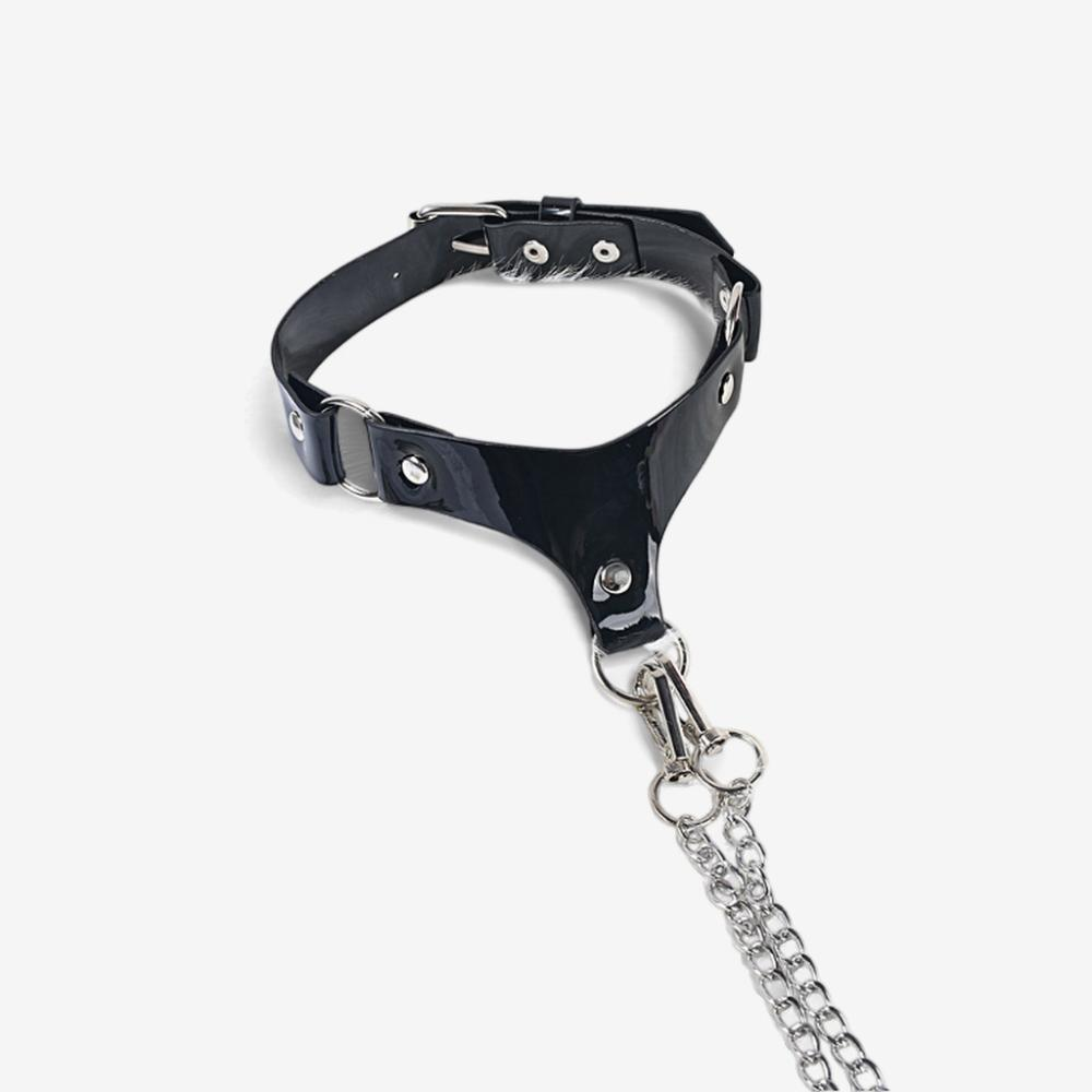 Design Details: Sleek black mesh with solid triangle coverage at the bust and a bold seam detail that contours the body. The silver chain and leather cuff harness set is detachable, adding BDSM allure.