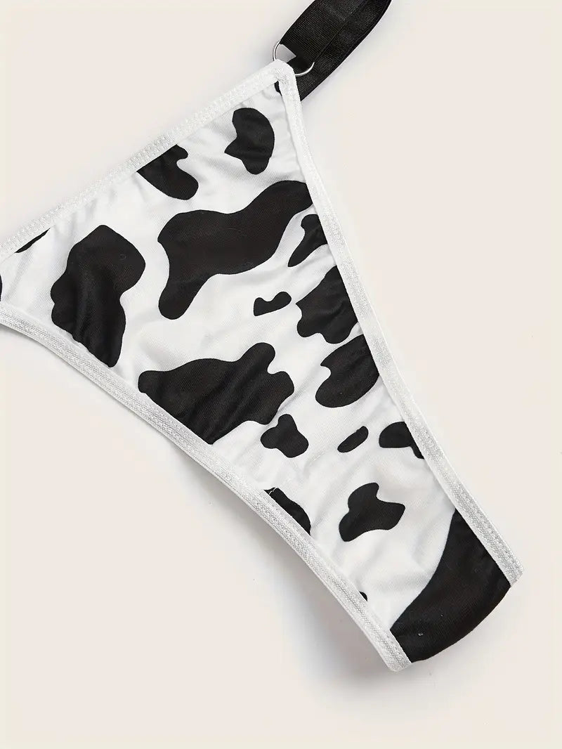 The standout cow-print pattern contrasts strikingly with black straps and metallic chain embellishments. The heart-shaped metal ring at the waist is a bold, eye-catching detail that enhances the playful bondage theme. Black satin bows add a feminine balance to the edgy design.