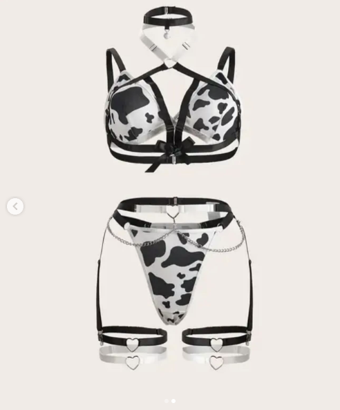 Picture this: you enter the room with slow, deliberate steps, the sound of your heels clicking softly against the floor. Your playful cow-print lingerie teases and surprises your partner, breaking any tension and inviting them into your playful world. Maintain strong, confident body language — shoulders back, slow hip sway, soft but commanding eye contact.