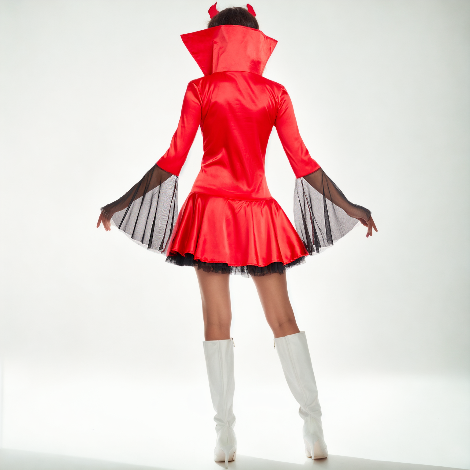 Material & Feel: The satin-like fabric is glossy and smooth, sliding over your curves and reflecting light—perfect for a devil in the spotlight. Mesh sleeves and underskirt add texture and a hint of mystery.