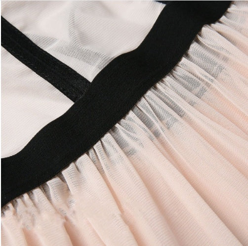 The gathered mesh flows loosely around the hips, concealing and flattering without clinging. It also adds motion, bringing lightness and sensual energy to the piece.