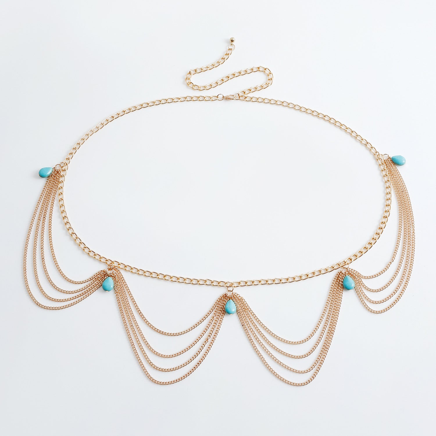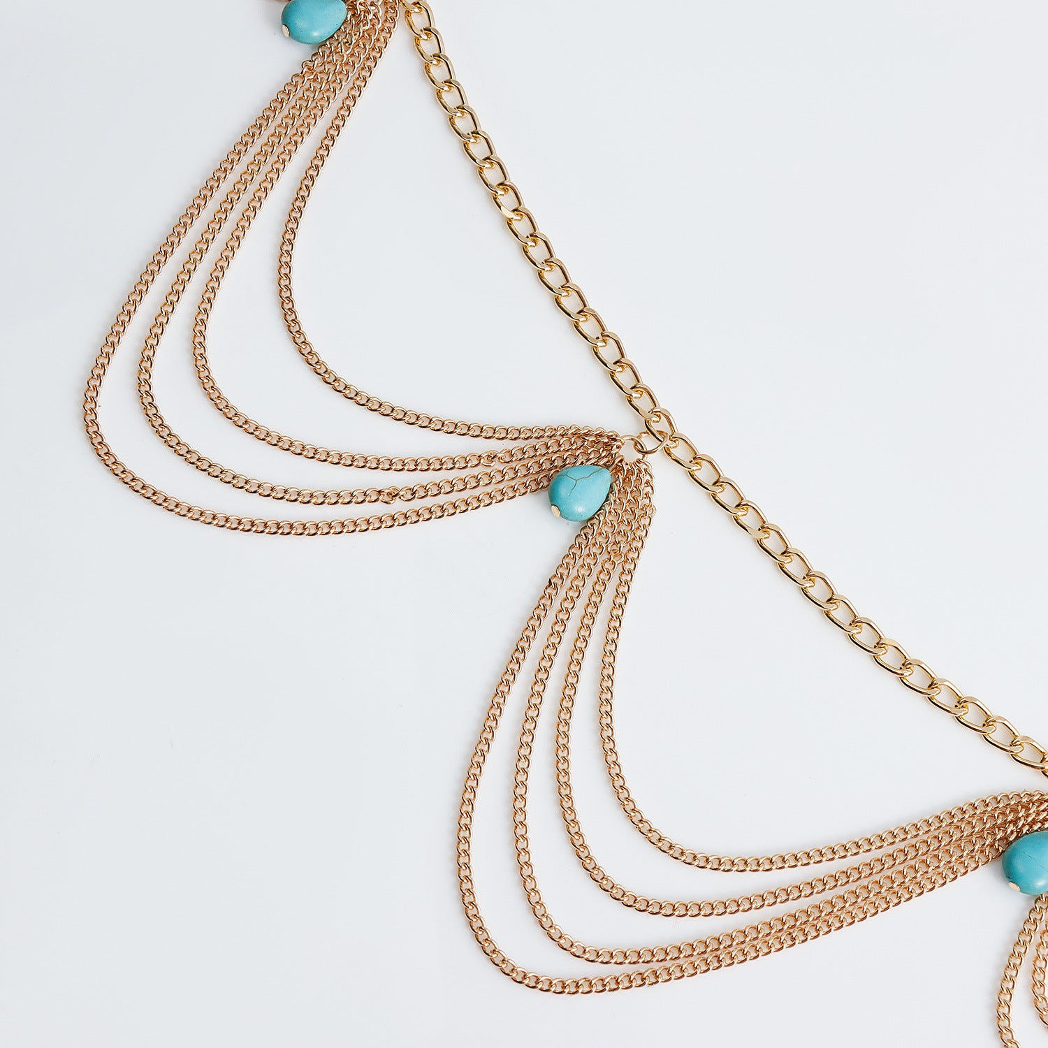 Crafted from high-polish gold-toned alloy, each draped section is anchored by a faceted turquoise bead, offering a sensual contrast that flatters sun-kissed skin and lingerie alike. The flattering, lightweight design hugs your curves comfortably, making it ideal for boudoir, beach, or bold nights out.
