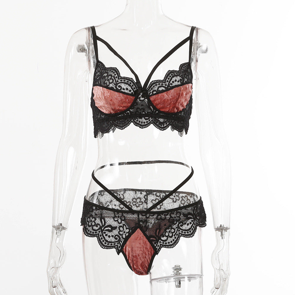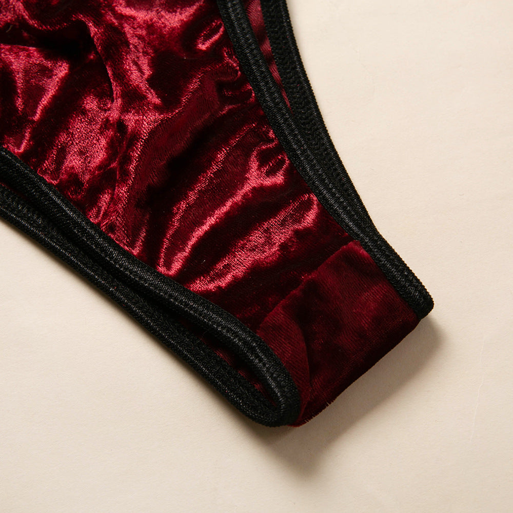 A luxurious blend of soft velvet and delicate lace, this lingerie set offers a bold yet romantic style with intricate strappy details.