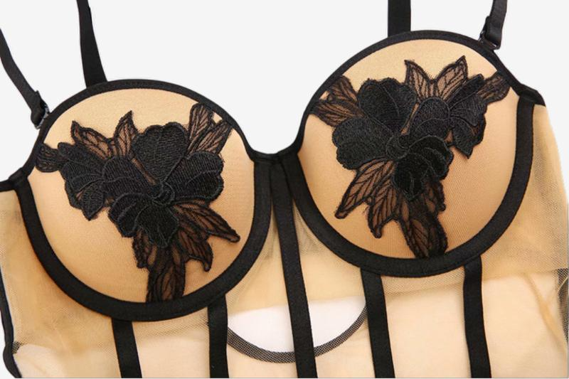 Fitted bodysuit silhouette with balconette neckline, semi-sheer mesh bodice, vertical contour panels, and contrasting floral appliqué at the cups.
