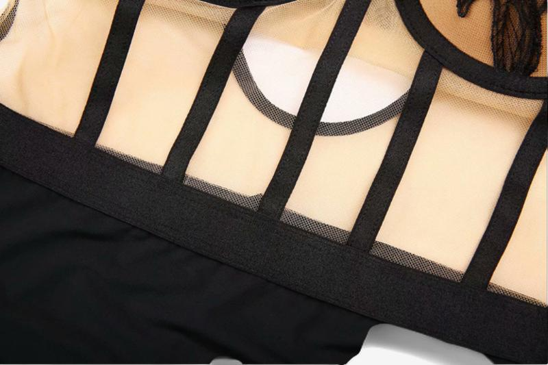 - Sheer mesh bodice with contouring panels
